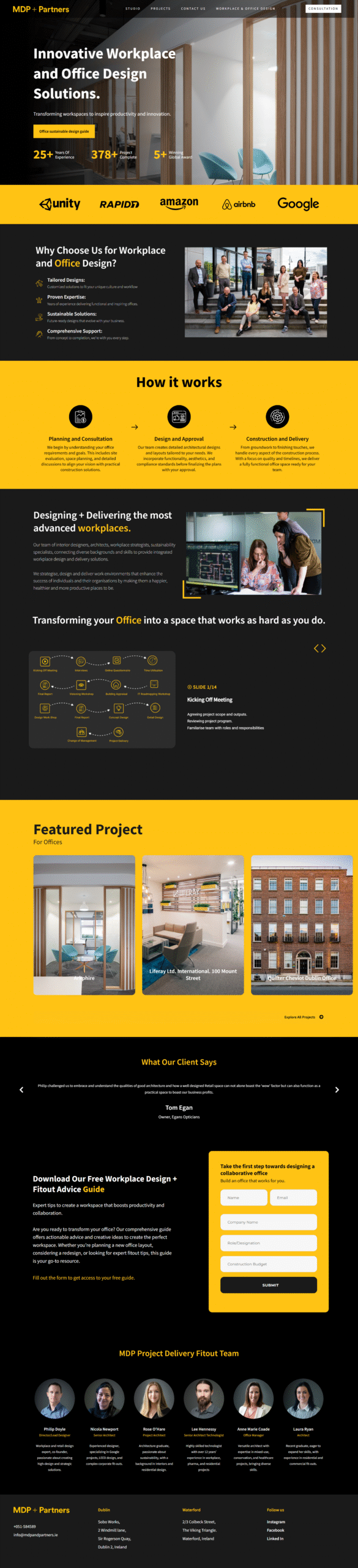 MDP + Partners is a Dublin‑Waterford based architecture and interior design studio specialising in residential, workplace, hospitality, adaptive reuse, and fit‑out projects. With 40 years combined experience, they deliver innovative, sustainable design-led solutions. The website was expertly crafted by Digiaxiom.